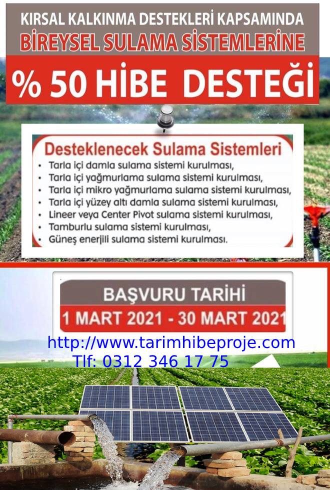 % 50 HİBE DESTEKLİ BİREYSEL SULAMA SİSTEMLERİNİN DESTEKLENMESİ İÇİN BAŞVURULAR BAŞLADI "2021 yılı Tarla içi modern sulama sistemleri kurulması hibe desteği işlemleri; Kırsal Kalkınma Destekleri Kapsamında Bireysel Sulama Sistemlerinin Desteklenmesi Hakkında Tebliğ (Tebliğ No: 2021/7) hükümlerine göre yürütülecektir. Bu Tebliğ, 30/1/2021-31/12/2025 tarihlerini kapsamaktadır. Başvurular 1 Mart'ta başlayıp 30 Mart 2021 tarihi mesai bitiminde sona erecektir.